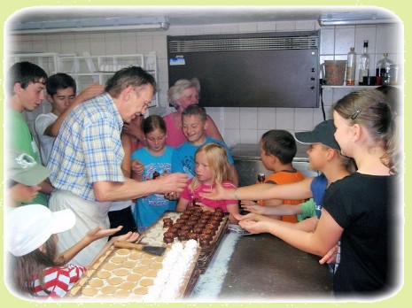 Bei der Besichtigung wurde vorgeführt, wie die leckeren Köstlichkeiten entstehen. Natürlich durfte man auch an den Zutaten naschen und probieren. Nachdem sich noch reichlich mit Schokoküssen eingedeckt wurde, bewährten sich bei den warmen Temperaturen die mitgebrachten Kühltaschen.