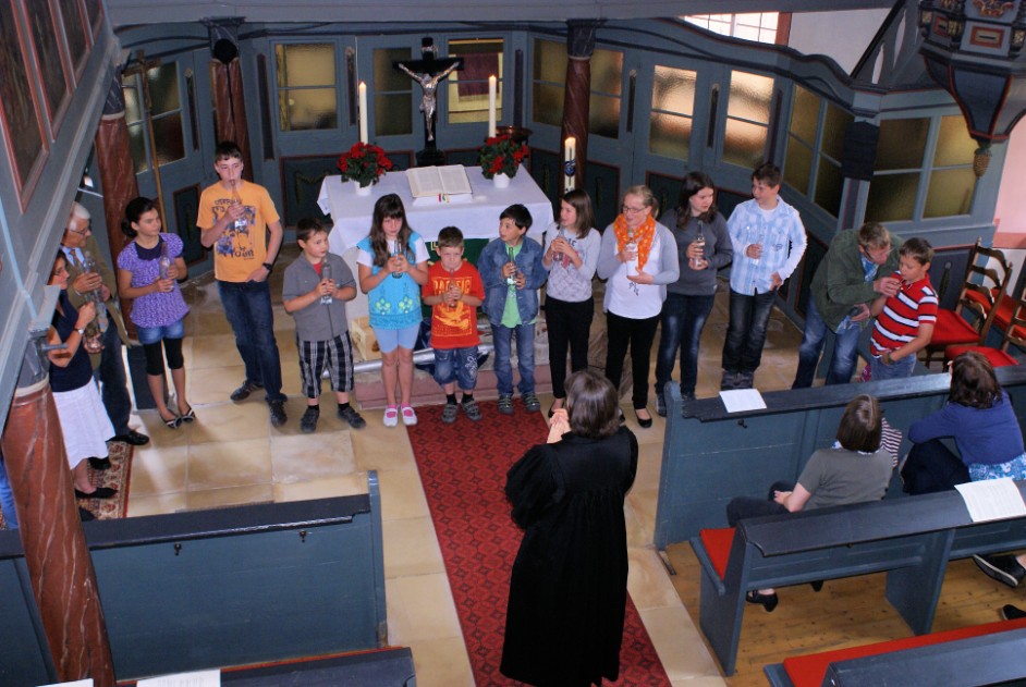 Im Anschluss erklärte die Pfarrerin mit unterschiedlich gefüllten und so gestimmten Wasserflaschen die Funktionsweise der Orgelpfeifen. Dann versuchten 15 mutige Gottesdienstbesucher unter ihrer Anleitung ein Lied zu „blasen“. Im zweiten Anlauf gelang das auch recht gut. Jedenfalls erkannte Udo die Melodie sofort.