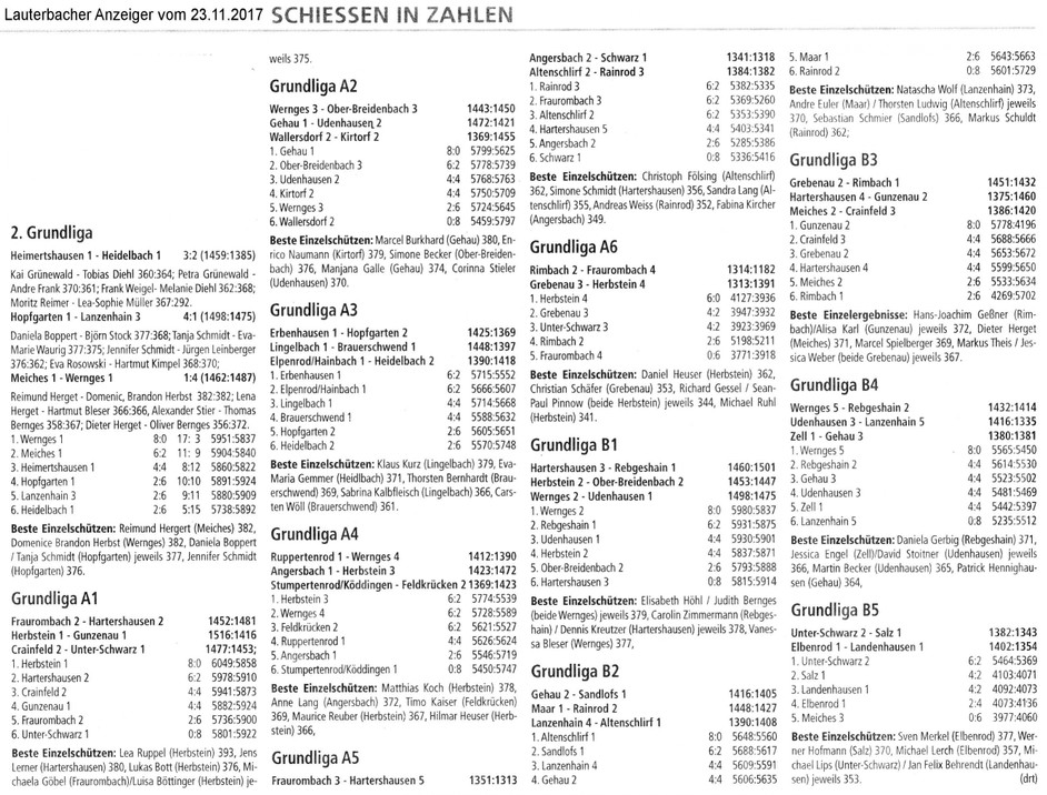 Herren: 1. Damian Kontny (Baunatal) 391... 27. Sven Karney (Lanzenhain) 383, 30. Lars Ruhl (Herbstein) 382,41. Jürgen Kimpel (Lanzenhain) 380, 59. Stephan Kastl (Crainfeld) 377, 60. Christoph Bloßer (Crainfeld) 377, 74. Dominik Otter (Crainfeld) 374, 89. Thomas Bernges (Wernges) 370, 90. Tim Müller (Lanzenhain) 369,105. Jens Körber (Herbstein) 363,107. Jens Häuser (Herbstein) 363. Mannschaft: 1. Baunatal 1164,9. Lanzenhain 1132 (Sven Karney 383, Jürgen Kimpel 380, Tim Müller 369), 11. Crainfeld 1128 (Christoph Bloßer 337, Stephan Kastl 377, Dominik Otter 374), 18. Herbstein 1108 (Jens Körber 363, Jens Häuser 363, Lars Ruhl 382).